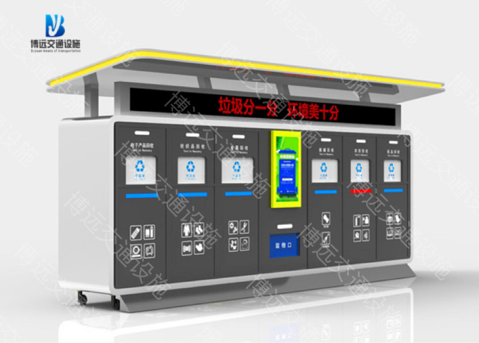 在現(xiàn)場(chǎng),記者看到這臺(tái)大型設(shè)備不僅設(shè)置了廚余垃圾、可回收物、其他垃圾、電子和化妝品垃圾的箱體外,在設(shè)備的上方還設(shè)置了一個(gè)LED顯示屏,上面滾動(dòng)播放著垃圾運(yùn)輸、回收、打包、處理、儲(chǔ)存的整個(gè)流程。
