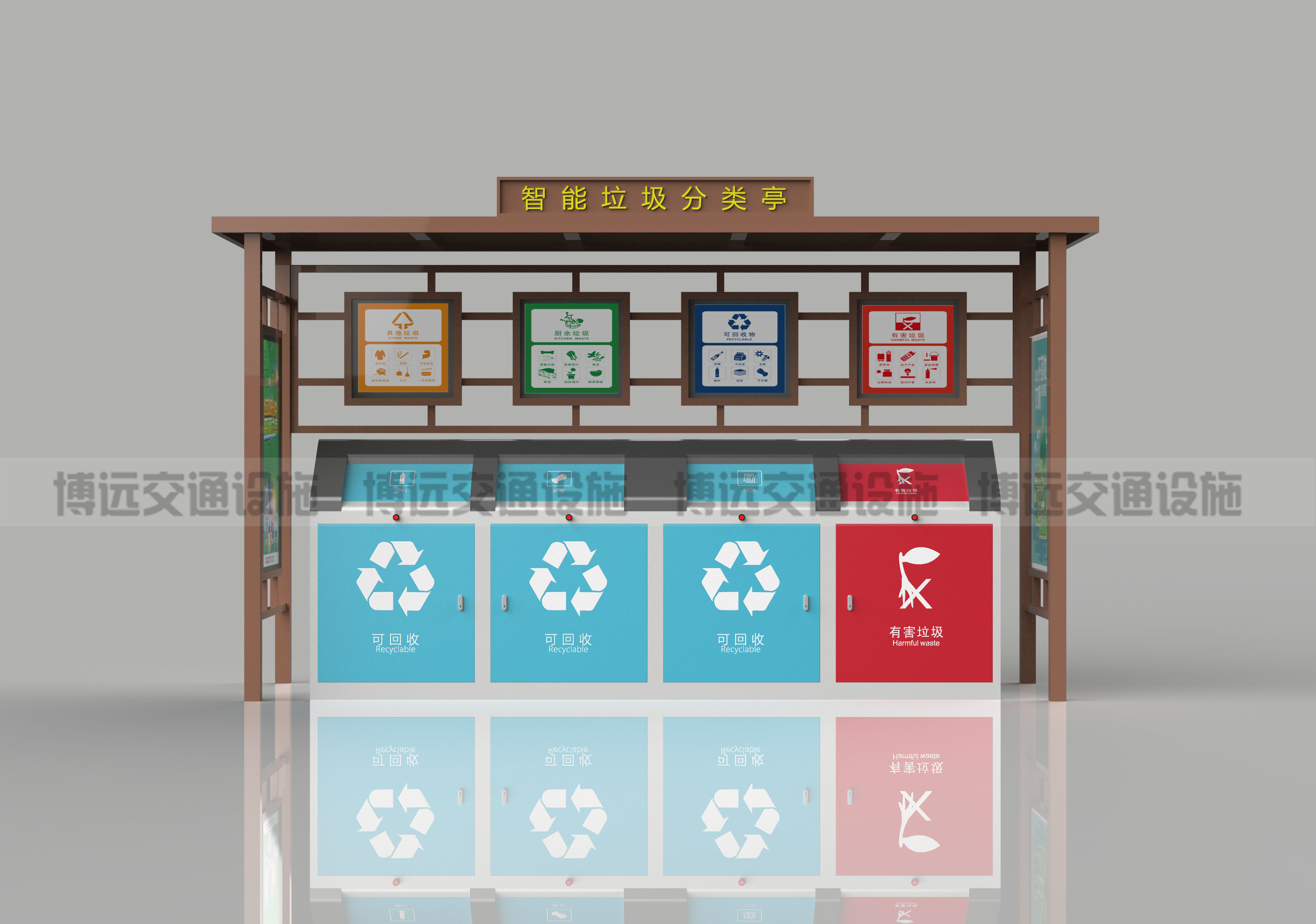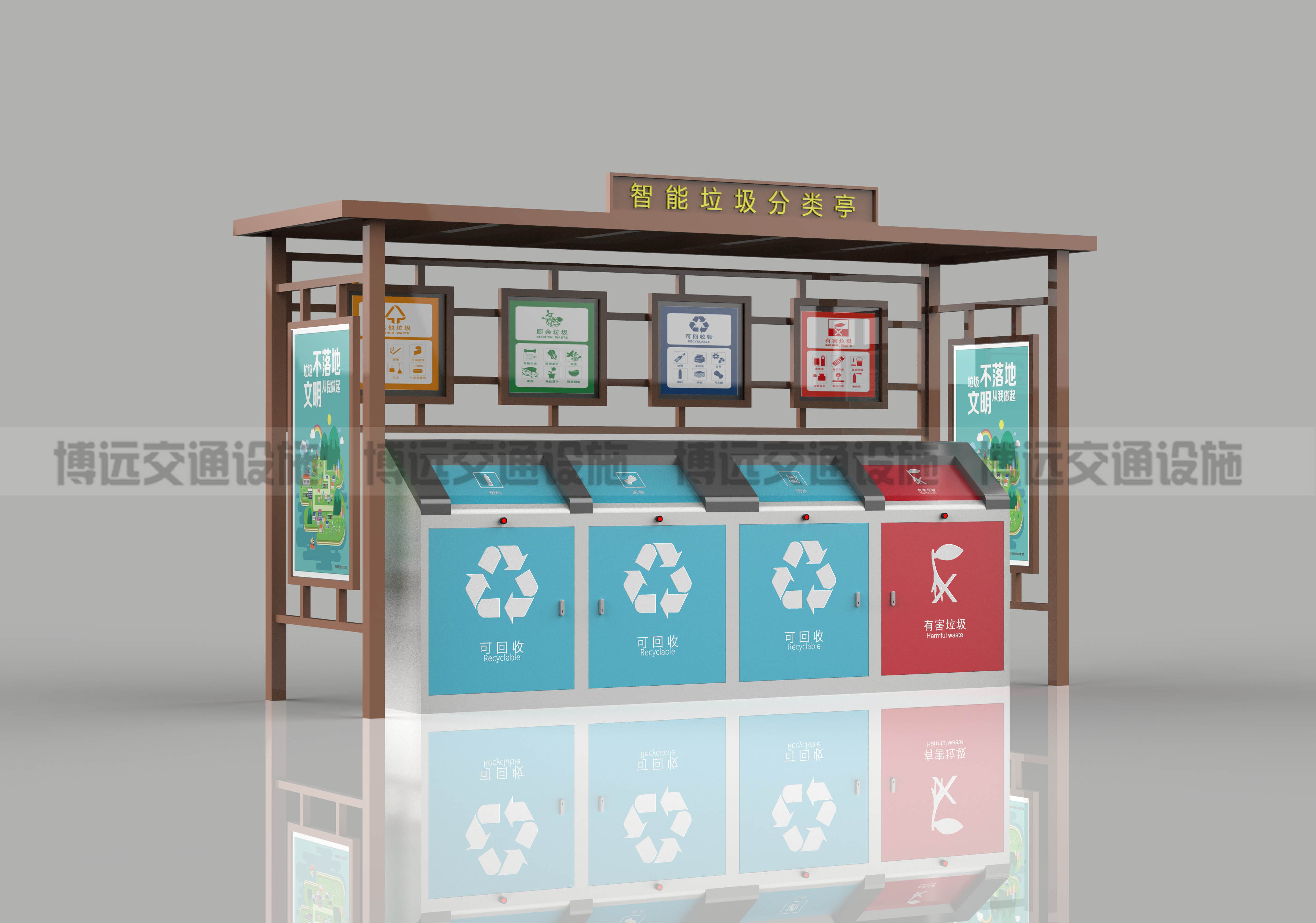 生活垃圾分類收集是城市生活垃圾處理的主流趨勢(shì),也是現(xiàn)代城市文明進(jìn)步的標(biāo)志之一。有利于提高垃圾清運(yùn)效率,有利于再生資源的循環(huán)利用,減少環(huán)境污染,減輕環(huán)衛(wèi)工人日常清掃的壓力。垃圾分類亭分為基礎(chǔ)設(shè)施、公益宣傳欄、立柱、頂棚等。亭內(nèi)設(shè)置可回收物、有害垃圾、廚余垃圾等垃圾桶。垃圾箱、宣傳欄均設(shè)有垃圾分類的宣傳標(biāo)語(yǔ),群眾可根據(jù)垃圾箱的提示將廢棄生活垃圾投放到相應(yīng)的垃圾箱內(nèi)。