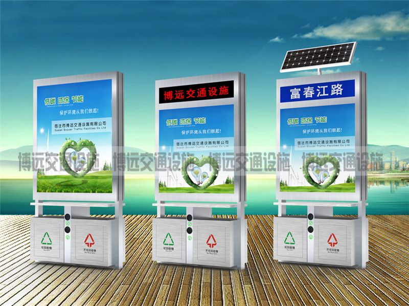 太陽能廣告垃圾箱是一種造型時尚,設(shè)計合理的新型設(shè)備,箱體本身采用鍍鋅板/不銹鋼為主體,具有硬度高、韌性好、耐高溫、防腐蝕、抗老化、防裂阻燃等特點,能源可以循環(huán)利用,壽命可達8-10年。
