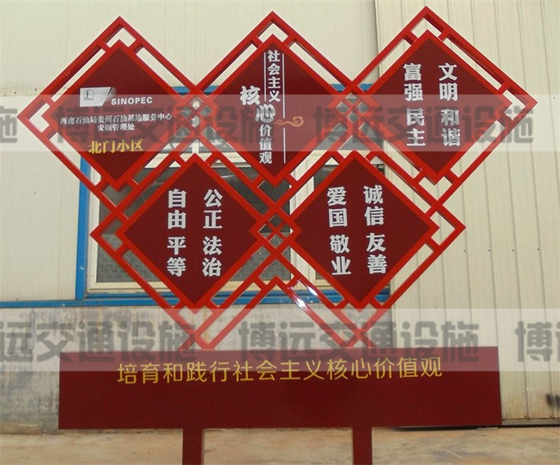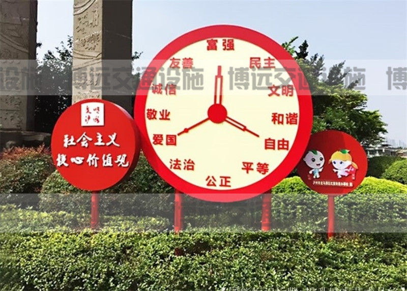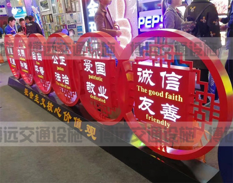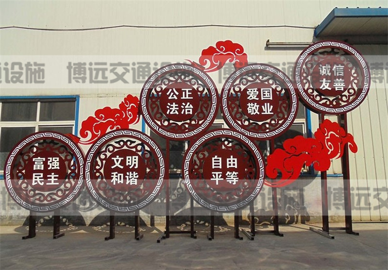 自黨18大以來,社會主義核心價值觀作為社會主義精神的宣揚(yáng)載體,同時作為城市或者鄉(xiāng)村空間的藝術(shù)裝飾物,江蘇博遠(yuǎn)在設(shè)計中特別重視中國夢核心價值觀標(biāo)識牌對空間環(huán)境的美化作用。注重核心價值觀藝術(shù)性功效的彰顯,并不是一種舍本逐末的做法,而是兼具實用性與藝術(shù)性的社會主義核心價值觀標(biāo)識牌,可以在我們需要它的時候,給予我們心靈上的鼓舞和指引,而我們不需要它的時候,它與周邊環(huán)境融為一體、相映成趣,所以我們要尋求核心價值觀功用性與藝術(shù)性的一個最佳平衡點,不能顧此失彼,而是要力求兩相得宜。