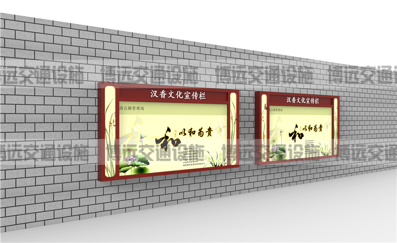 宣傳欄屬于VI應(yīng)用里的一種,是組織或企業(yè)單位等進行自我宣傳的有效手段。它常被應(yīng)用于街道,工廠,酒店等公共場所,是企業(yè)自我宣傳的有利武器。宣傳欄一般采用冷軋鋼板、不銹鋼為框架,鋼化玻璃或者耐力板為面板,面板可以打開更換宣傳畫面。