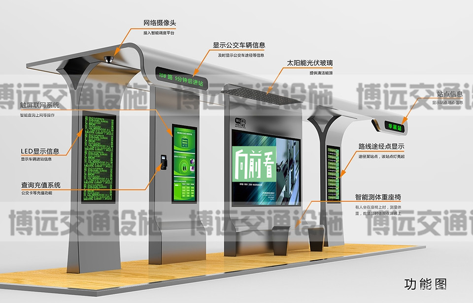 隨著城市化水平的深入推進(jìn),城市街具的重要性日益凸顯,公交候車亭、站牌在城市、鄉(xiāng)鎮(zhèn)及農(nóng)村的普及程度越來(lái)越高,城市基礎(chǔ)設(shè)施日益完善,江蘇博遠(yuǎn)交通設(shè)施未來(lái)的公交站牌、候車亭將向智能化、人性化、品質(zhì)化方向發(fā)展,電子站牌將逐步取代傳統(tǒng)的公交站牌。