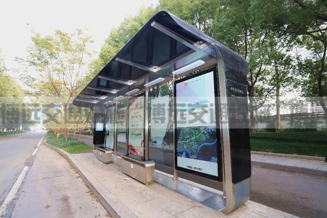 新款候車(chē)亭長(zhǎng)8米左右,黑白相間,顏色采用“類(lèi)蘋(píng)果式”的獨(dú)特風(fēng)格,流暢的線條感配以黑白顏色分明的體塊感,極具現(xiàn)代城市高科技風(fēng)采,此外,候車(chē)亭旁邊還增加了電子顯示屏,中間放置公益廣告、車(chē)輛行駛線路圖,右邊則是電子線路實(shí)時(shí)顯示屏。流暢的線條感配以黑白顏色分明的體塊感,形成 “觸摸屏”的獨(dú)特風(fēng)格
