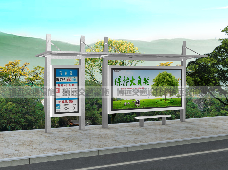 2.候車亭制造時(shí),其公交指示牌安裝在候車亭頂端顯眼位置,確保乘客一眼就能看到,并且指示牌必須帶有照明裝置,便利乘客夜晚候車。